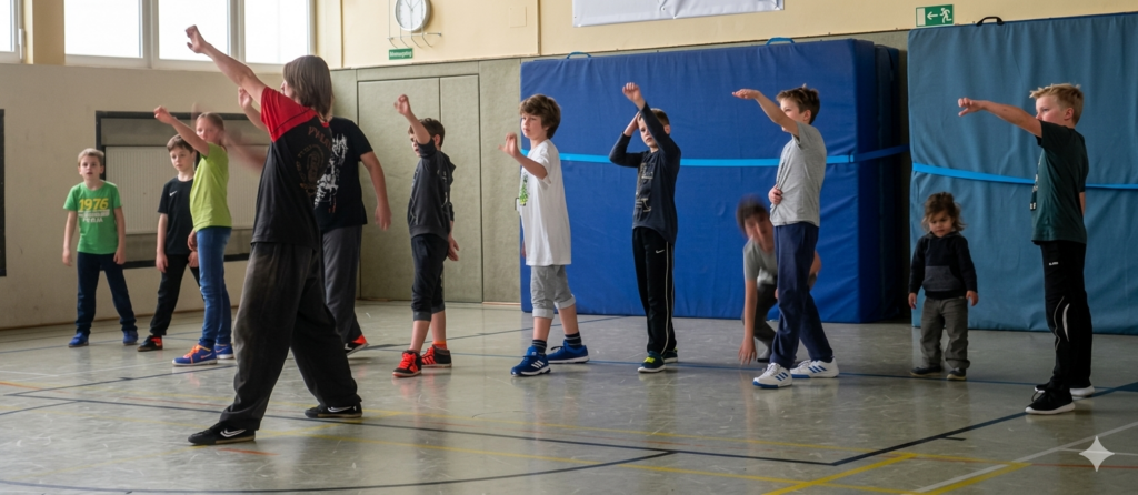 Hier biete ich den kleinen schon die Möglichkeit, Kraft und Standsicherheit zu lernen. Dabei passe ich individuell die Belastung an, so dass die Kinder ausgelastet aber nicht überlastet sind.